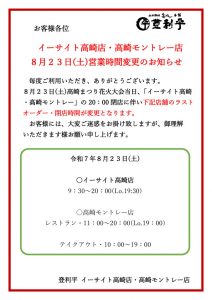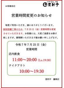 厨房設備工事のため、7月25日(金)営業時間を変更