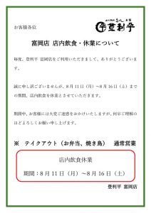 誠に申し訳ございませんが、8月11日(月)~8月16日(土)までの期間、店内飲食を休業とさせていただきます。