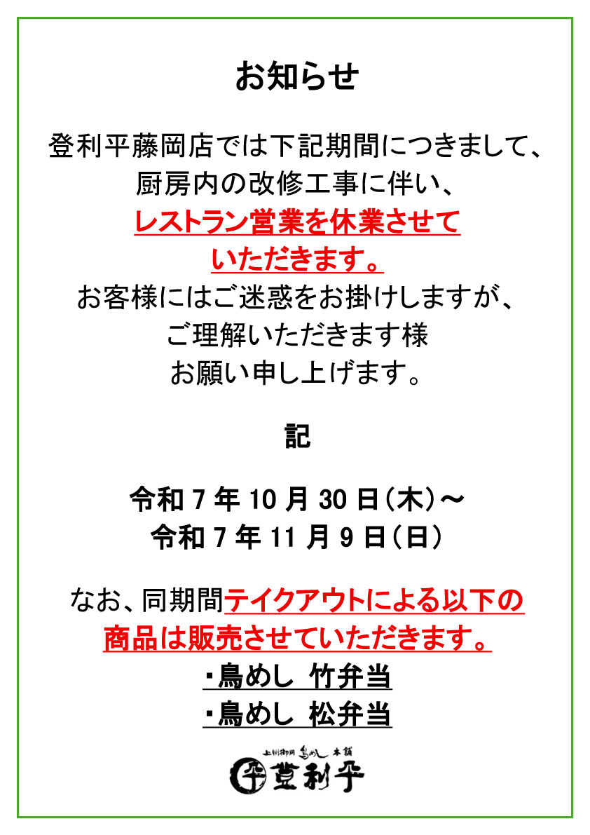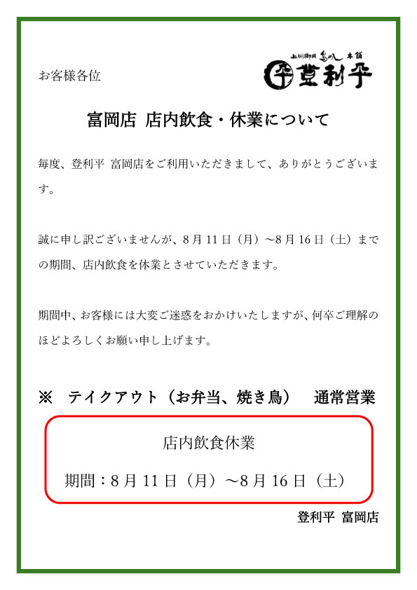 登利平藤岡店では下記期間につきまして、