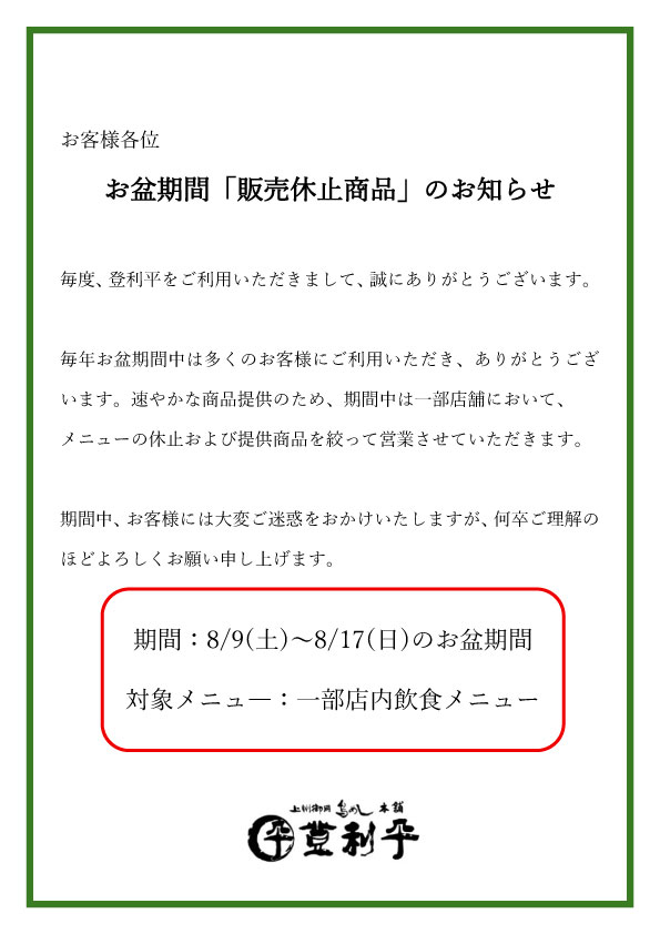 毎年お盆期間中は多くのお客様にご利用いただき、ありがとうございます。速やかな商品提供のため、期間中は一部店舗においてメニューの休止および提供商品を絞って営業させていただきます。