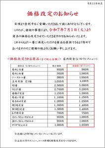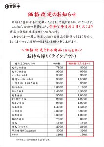 このたび、諸般の事情により、令和7年4月1日(火)よりテイクアウト商品の価格を改定させていただきます。