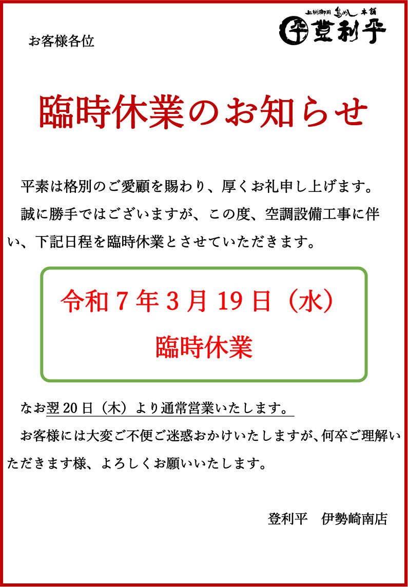 日頃より登利平をご愛顧いただきまして誠にありがとうございます。