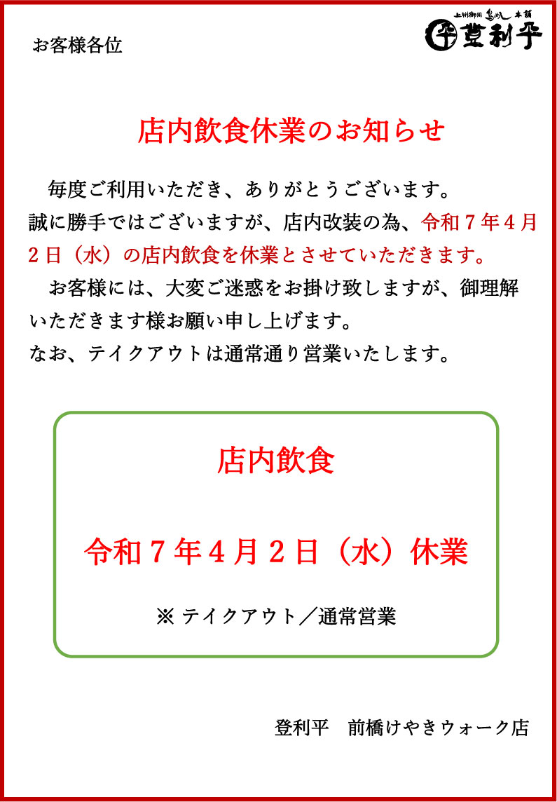 令和7年4月2日(水)の店内飲食を休業とさせていただきます。