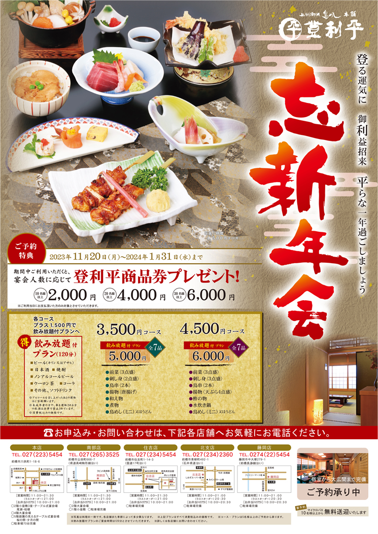 2023年11月20日(月)~2024年1月31日(水)までの期間中にご利用頂きますと宴会人数に応じて「登利平商品券」をプレゼント!