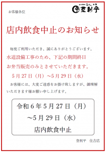 お客様各位 店内飲食中止のお知らせ